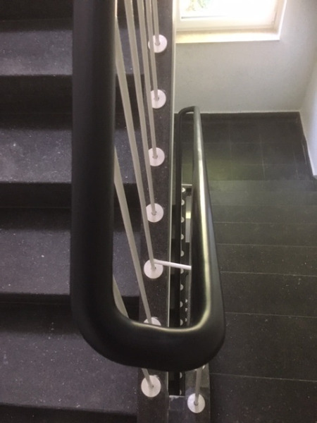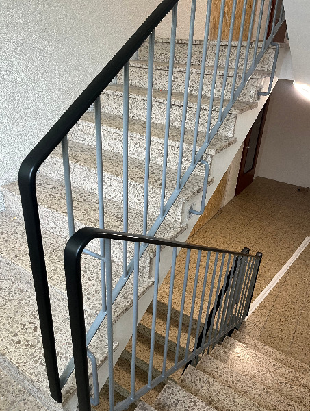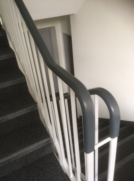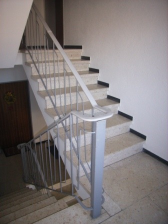 Neu gestalteter Treppenbereich mit einem Kunststoffhandlauf 40/8 mm. |